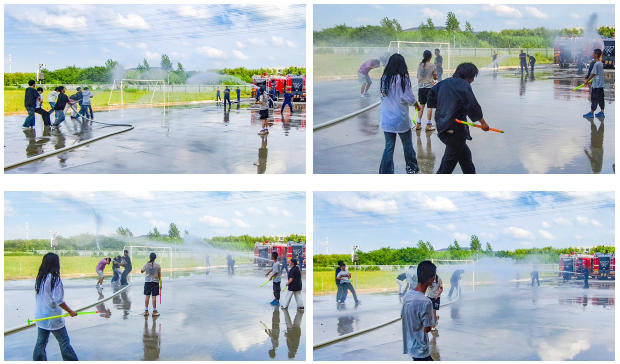“消防员与学生打水仗” 作为本次演练的新增亮点,一开启便将现场气氛推向高潮。宽阔的操场上,消防员操控消防车上的高压水枪,向学生区域喷射出晶莹水柱;同学们手持小水枪,兴奋地 “反击”,清脆的笑声与欢呼声传遍校园。别具特色的娱乐互动不仅拉近了消防员与学生的距离,更让大家在玩乐中加深对 “水压控制”“水枪使用角度” 等消防知识的理解,让消防安全教育以更有趣的方式深入人心。